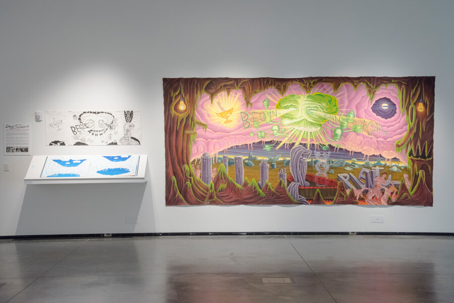 Sandlin worked closely with students to create an edition of colorful lithograph prints. Sized at 22 by 30 inches, the print was created by painting with inks, Xerox toners and paint pens onto transparency films. The films were then exposed to photographic lithography plates, one color at a time. The frenetic, science fiction cartoon-inspired image is typical of Sandlin’s style, used to express ideas of individual freedom and engage in social critique. The editioned print he made with students, “Ghosts of Undead Heroes,” is on sale in the DAAH online store.