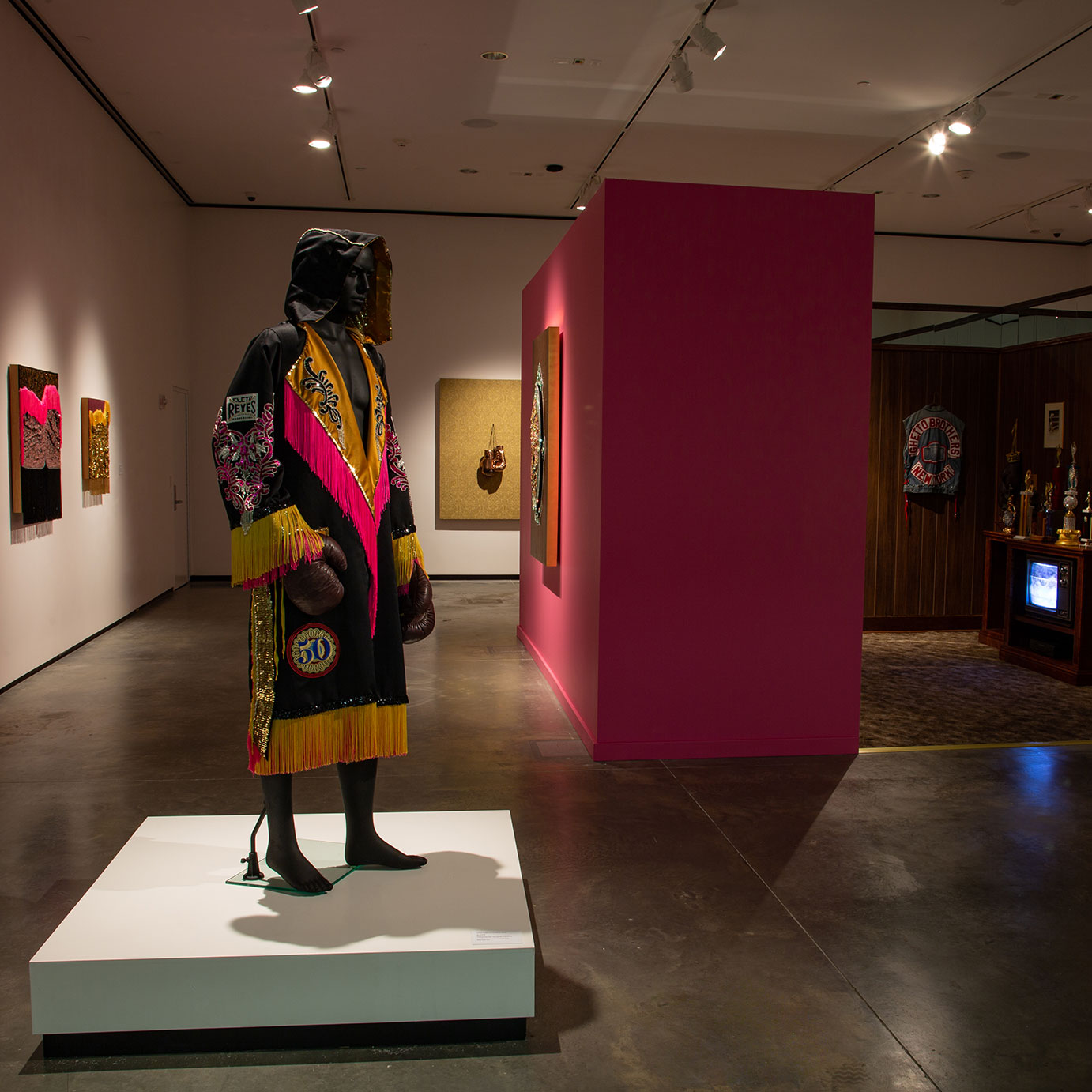 BOXED, features a variety of works exploring the sport of boxing. Boxing loomed large in the artist’s childhood household; he recalls watching a young Howard Cosell on ABC’s Wide World of Sports and the infamous “No Más” fight between Roberto Durán and Sugar Ray Leonard, occasions that also provided opportunities to bond with his father. The exhibition will present a series of mixed media paintings, sculptures, and a full- size replica of the artist’s childhood basement.