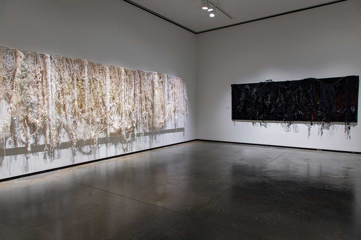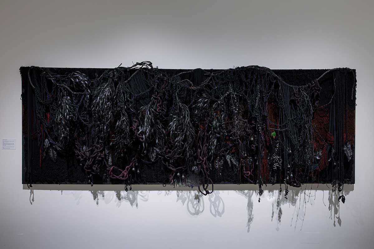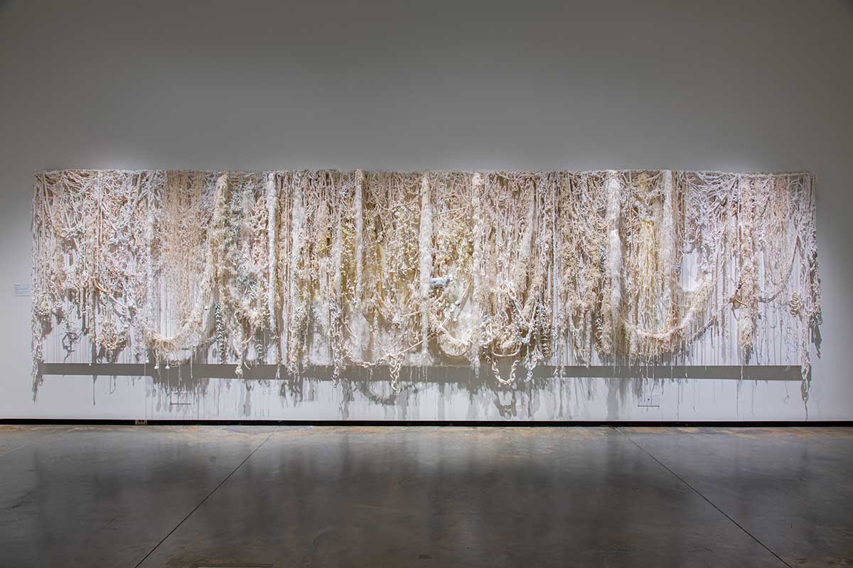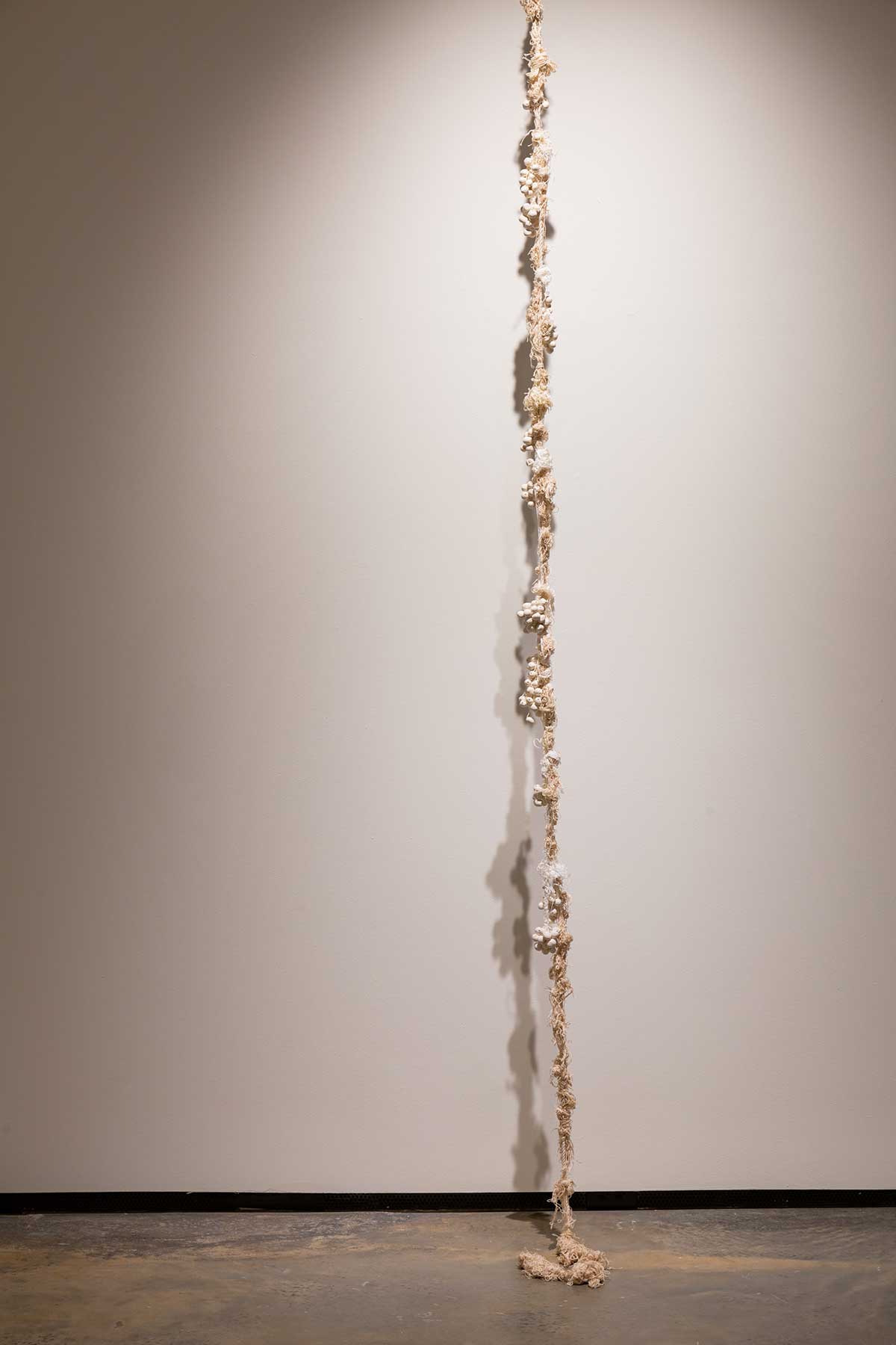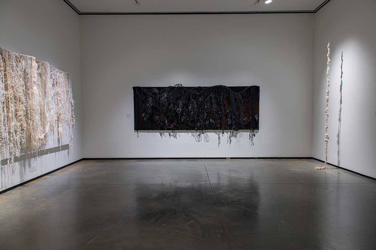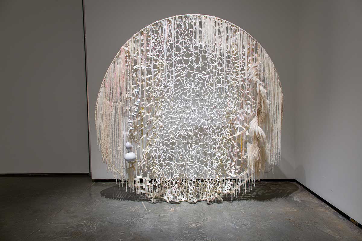Repurposed cloth and thread are the mediums of choice for artist Sonya Yong James who works with these materials to examine the intersection of our shared cultural mythologies and domesticity. She meticulously manipulates the materials, combining techniques like weaving, knitting, spinning, dyeing, felting animal hair and sewing, juxtaposing these with ceramic and found objects. Her wall sculptures move beyond traditional story telling woven into textile arts such as quilts, creating new environments that explore the roles that sexuality, memory, and death play in the development of our personal relationships. What do your eyes tell you to smell? If you could touch the work, what do you think you would feel? Can you almost hear something from your memories? Our sensory experiences often directly tie to past experiences and relationships with an object, shape, or texture evoking emotion or memory. Loose yourself within this installation, and you might find the influence that textiles hold in our collective memories, and the power a needle and thread have in what they create.
