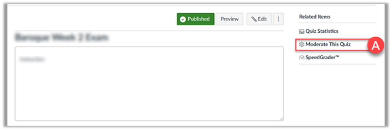 - Access the desired Quiz in Canvas, then click the Moderate This Quiz (A)