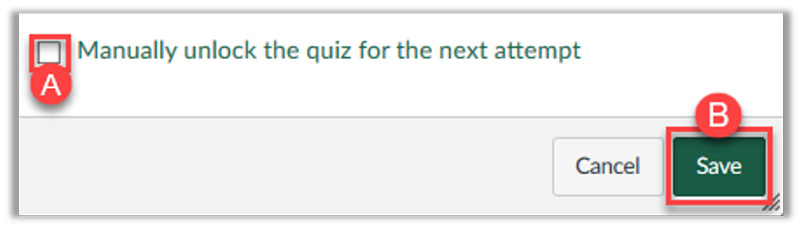 - When moderating a student’s quiz, check the box for Manually unlock the quiz for the next attempt (A).
