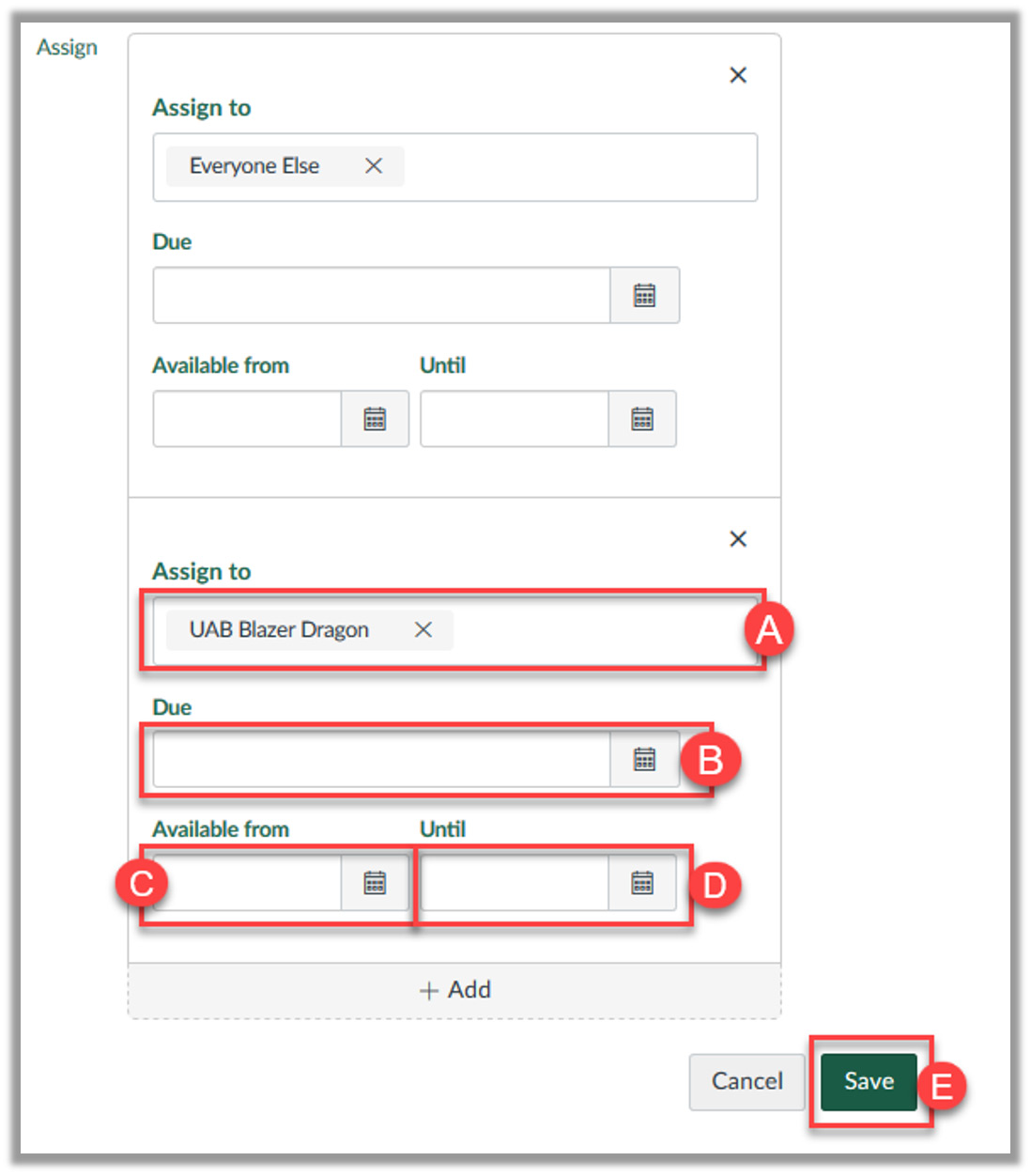 - Click to edit the Canvas Quiz, scroll down to the bottom then click the +Add button to create an additional assign card. This allows you to keep the originally set availability for the rest of the class but provide specific availability to others.