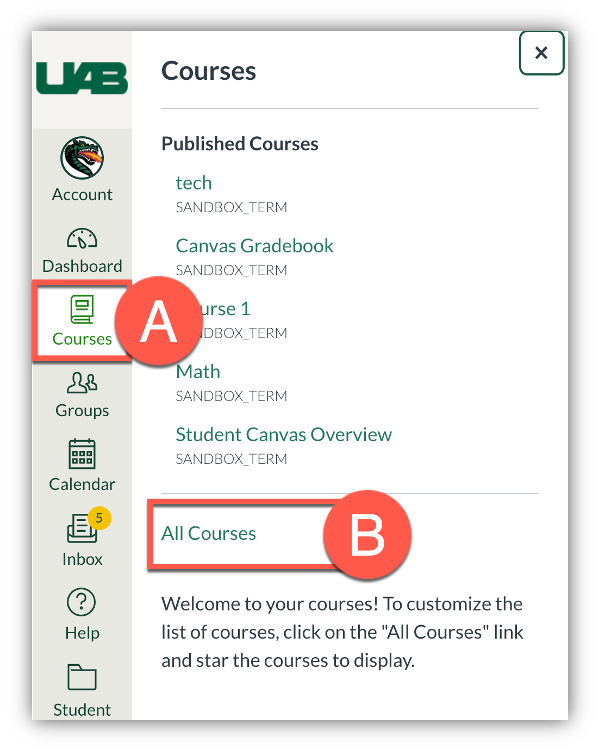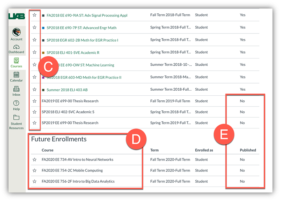 - Is the course listed under Future Enrollments? Check to see if your course is listed under Future Enrollments (D) section of the All course list. Courses are not set to open until 11 p.m. the day before classes start (shown on UAB Academic Calendar opens a new website) unless the instructor has enabled early access.