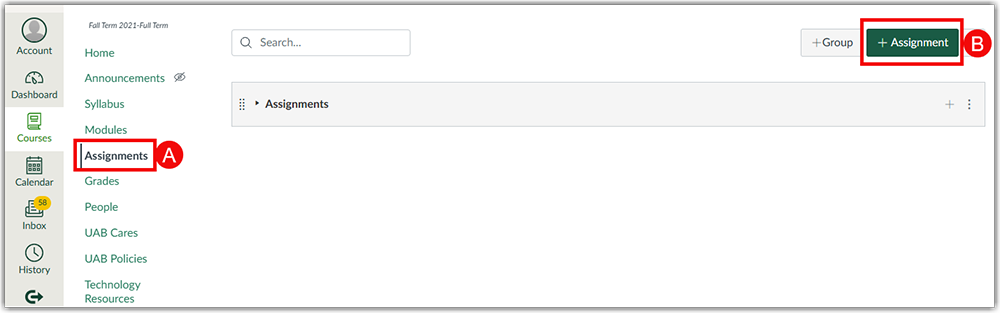 - Go to Assignments (A) tab in canvas and click +Assignment (B).