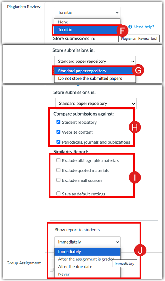 - Select the plagiarism review as Turnitin (F), choose to store the submissions in the Standard paper repository (G) or not to store the papers. The submissions can be compared with the student repository, website content, periodicals, journals and publications (H). The Similarity Report options allow the user to exclude bibliographic materials, and small sources (I). The visibility of similarity report can be restricted to students, the access to the similarity report for a submission can be set immediately, after assignment is graded, after due date or never (J).
