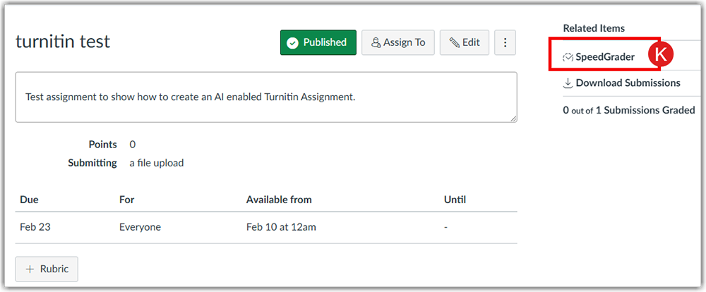 - Click on the Speed Grader (K) to check submitted assignments and Turnitin reports.