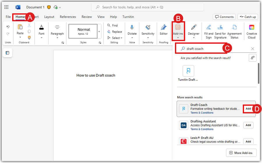 - Go to Home (A) and click on Add-ins (B). Search for ‘Draft Coach’ in the Search Bar (C). Verify that Draft Coach has been found, then Add (D) the extension.