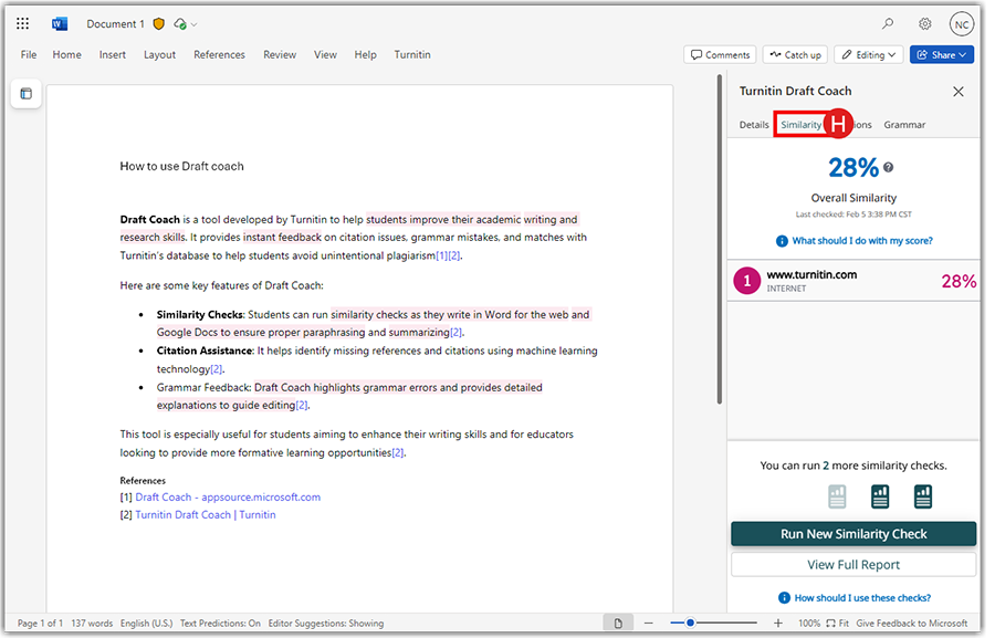 - Draft coach allows three similarity checks per document. The overall similarity is generated, and sources are listed under Similarity tab (H).