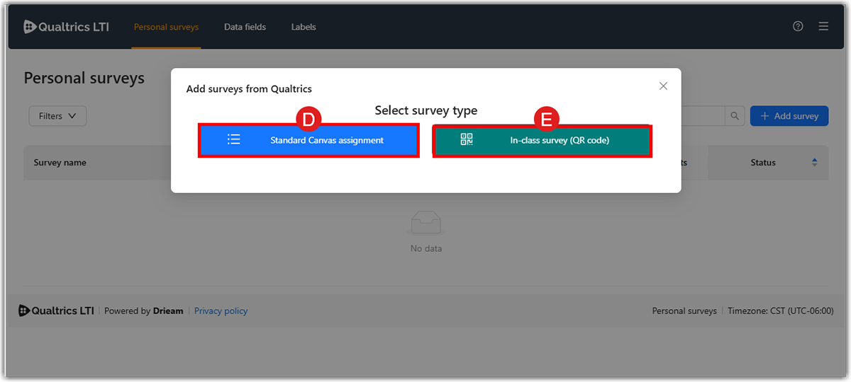 3. You will see two buttons on the pop-up window: Standard Canvas assignment (D) and In-class survey (QR code) (E). In-class surveys can be used during lectures where the teacher will provide a QR code for the students. Via scanning the QR code, students fill out the survey. Like standard Qualtrics LTI surveys, the in-class survey type can be added to any Canvas assignment. More information on what and how to create in-class surveys can be found on How to use in-class surveys guide opens a new website. Click on the Standard Canvas assignment (D).