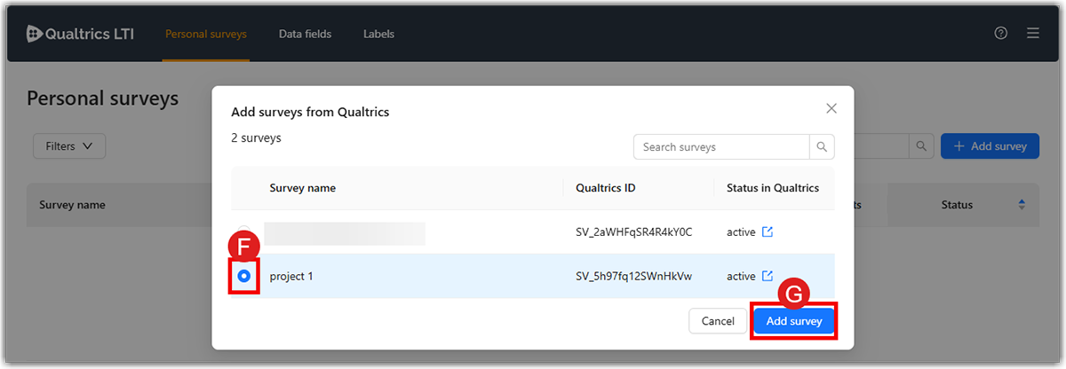 4. You will see all your published Qualtrics surveys in the pop-up window. Check the checkbox (F) next to the survey(s) you would like to add. Click Add Survey (G) to add it to your surveys.