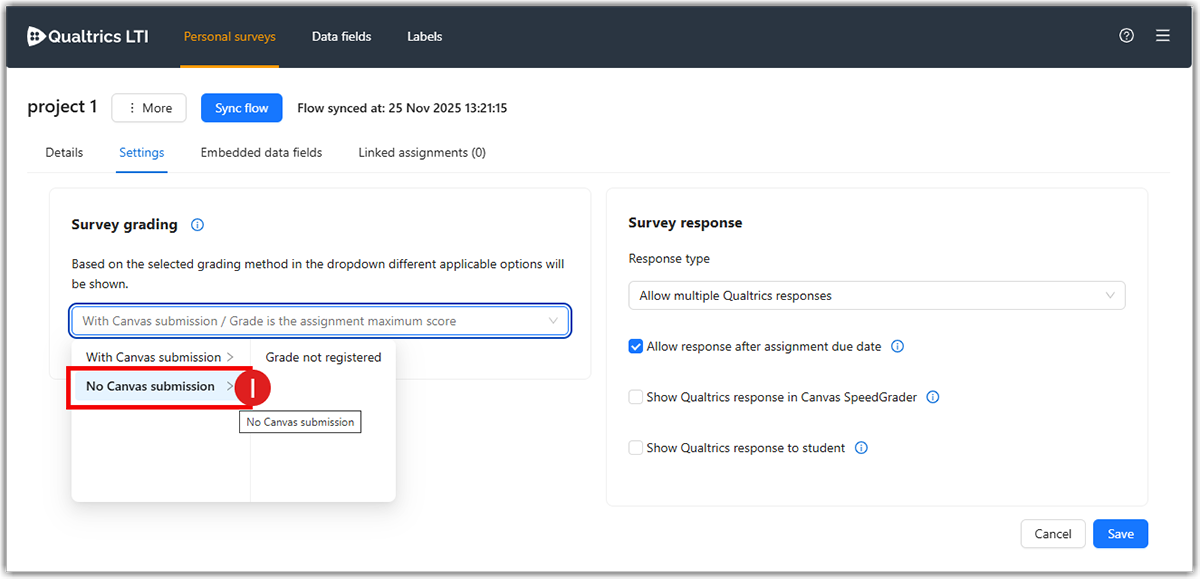 • Allow response after assignment due date: If this is checked, students can still submit the Qualtrics survey even after Canvas assignment due date passes.