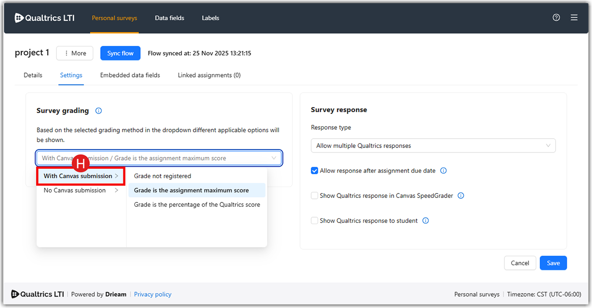 • With Canvas submission (H). This means Qualtrics will send a grade to the Canvas Gradebook.