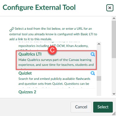 3. Left click on the Qualtrics LTI (C) from the list of external tools.