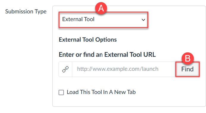 2. In the assignment setting, set the Submission type to External Tool (A) and click on Find (B).