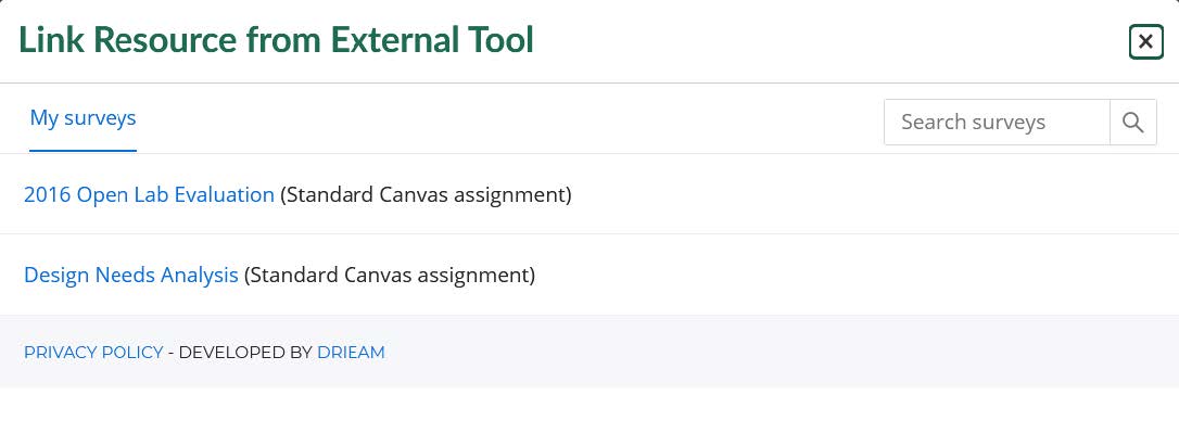 4. You will see the surveys added to Qualtrics LTI in a pop-up window. Left click on the survey you would like to add as an assignment.