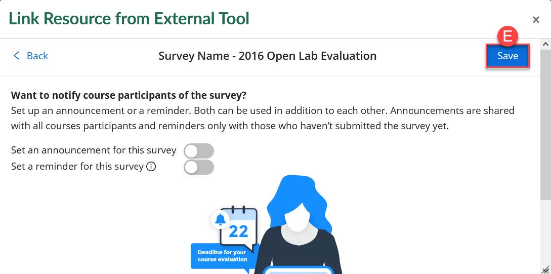 6. You can decide to add notifications (learn more about notifications opens a new website) to the survey. Once you click on Save (E) the survey will be added to the assignment.