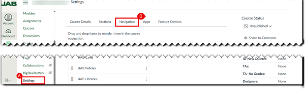 1. Go to Settings (A) in your Canvas course and select Navigation (B).