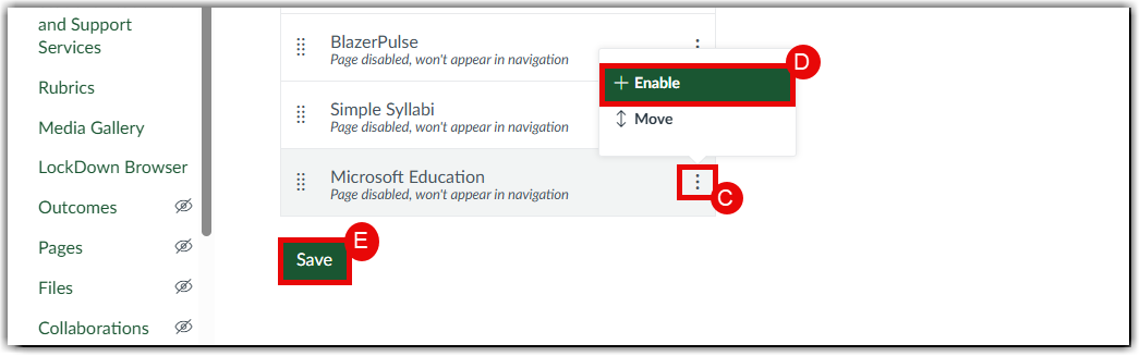 2. Scroll down to the bottom of the Navigation tab until Microsoft Education is visible. Click the three vertical dots (C) beside Microsoft Education, then click +Enable (D), and Save (E).