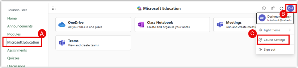 3. Select Microsoft Education (A), then click your Profile Icon (B) and select Course Settings (C).