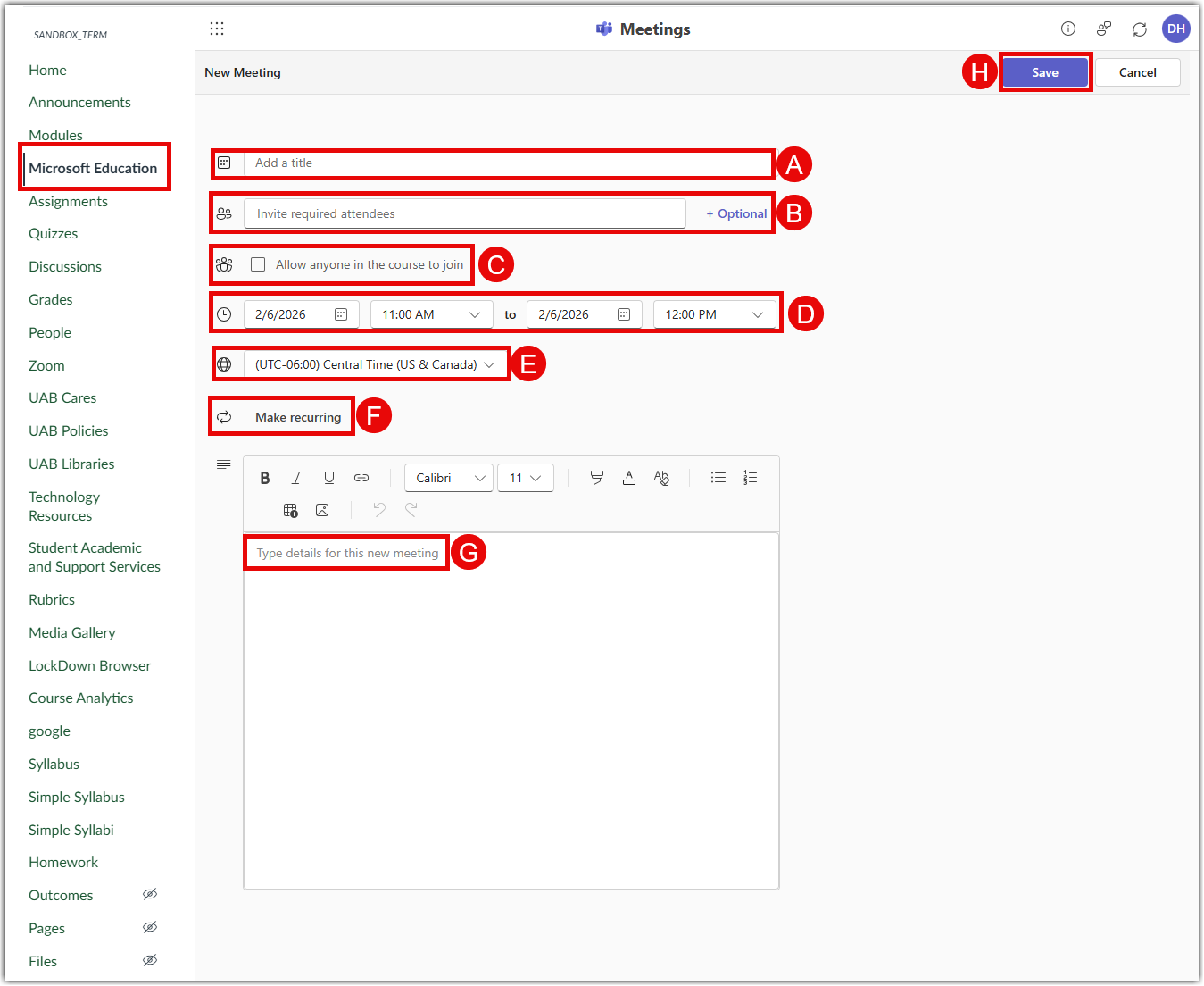 To use Microsoft Teams Meetings, Microsoft Education must be enabled in that course. This must be done in each course where you would like to use Microsoft Teams Meetings integration.