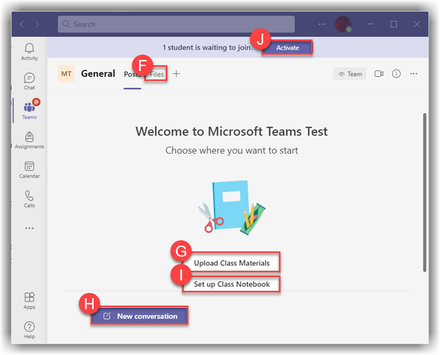 - In your Teams inside of Microsoft Education, there will be a message Welcome to [Your course name] in the center. Upload resources using the Files (F) tab or Class Materials (G) button. Start New Conversations (H) with the class. A OneNote Class Notebook (I) can be created. Your Class Team and its contents is invisible to students until you Activate the Team. Press Activate (J) when you are ready for students to have access to the Class Team.