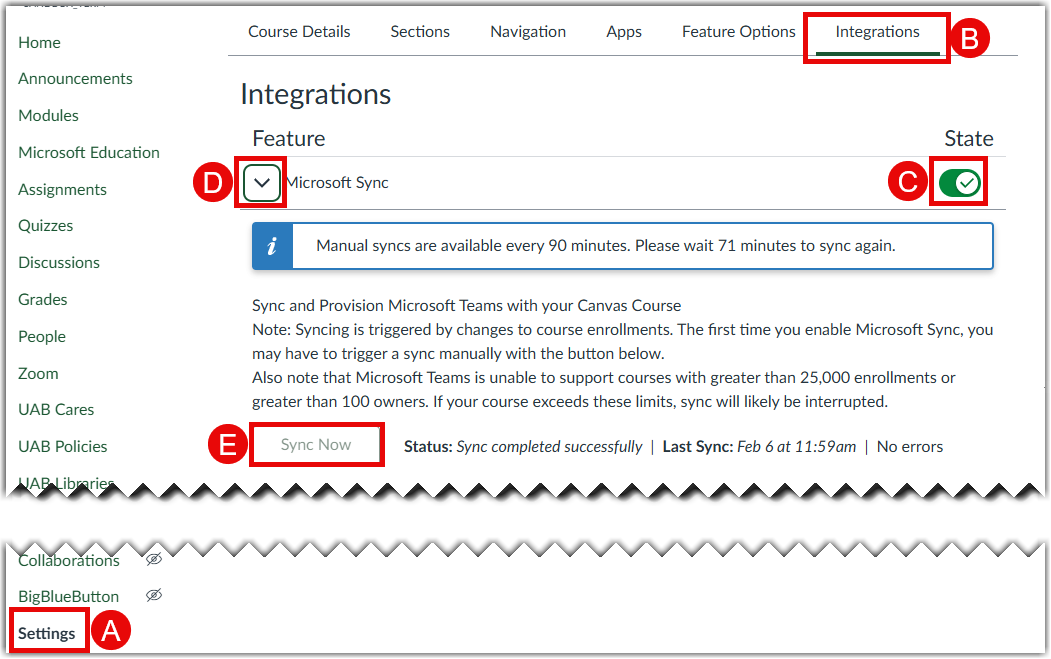 - Click Sync Now (E) to create a Microsoft Class Team for the course. The Team creation may take several minutes. The Status will change to Sync manually scheduled.