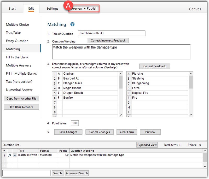 - An editable preview of your Respondus file will display after import. Editing here is not recommended as Canvas has better tools available. Click Preview + Publish (J) to move to the Preview + Publish tab.