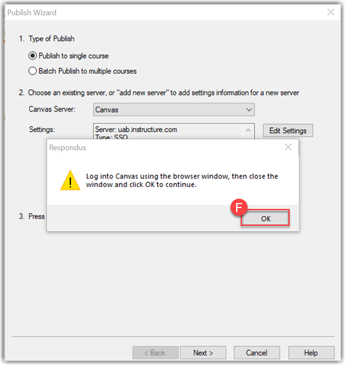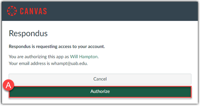 - Respondus should connect to Canvas automatically with no issues. During the Publishing Wizard if you have difficulties connecting, first check for a separate window with an authorization prompt (A). Note: This window may ask for your UAB credentials if you are not already logged in to Canvas.