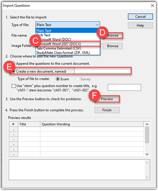 - Browse (D) to the location of your Respondus 4 0 formatted Word Docx.