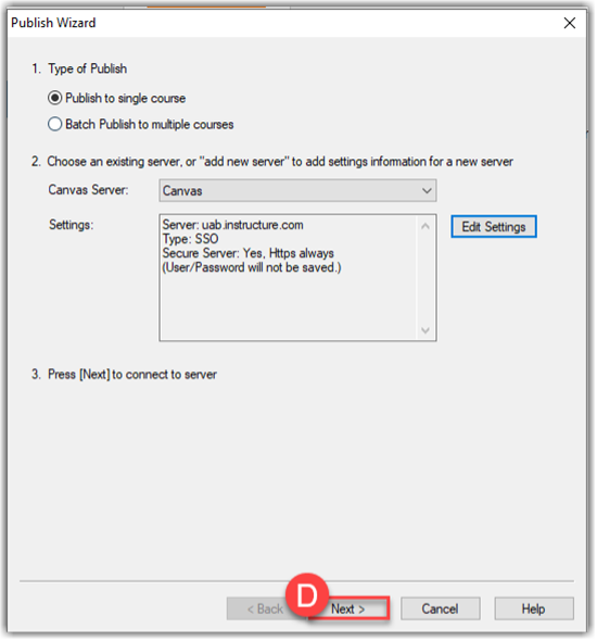 - The Publish Wizard should have the correct settings for the UAB Canvas server already in place. Select Next (M). Note: If the correct settings are not in place, see the Respondus Connection Guide.