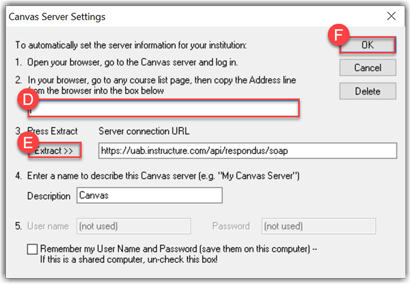 - Back in the Respondus Canvas Server Settings window, paste the URL into the box (D), press Extract (E), then OK (F). The publish wizard should pick up where you left off.