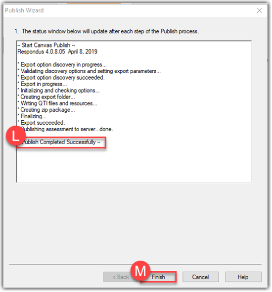- Wait until the status window says Publish Completed Successfully (T) to press Next (U). Congratulations! Your existing quiz/test/exam has been imported into Canvas as an unpublished Quiz.