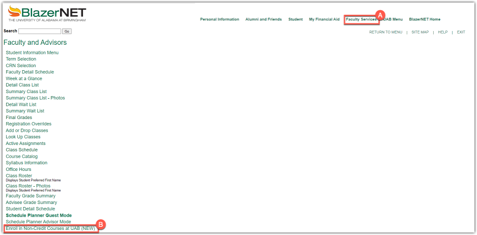 - Faculty and advisors, select Faculty Services (A), then Enroll in Non-Credit Courses at UAB (B).