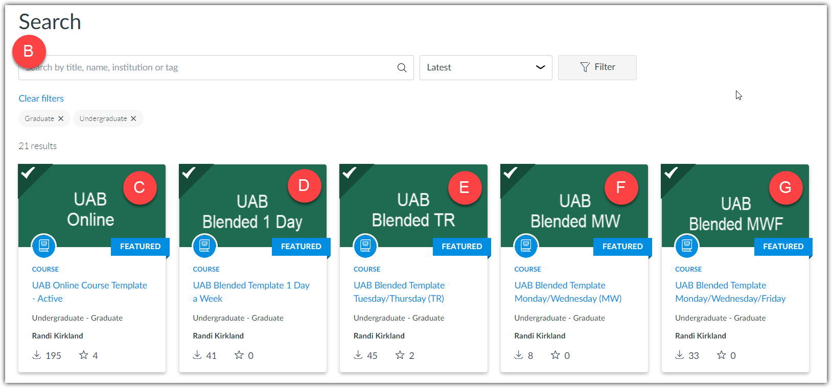 2. Type “Template” in the Search (B) bar to limit the results to only Course Templates. The course templates are customized for the course meeting schedule - either online or by the days of the week.