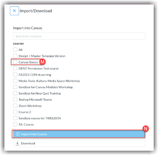 4. A list of courses where you have Content Creation rights will be displayed. Select the desired destination course(s) (M). Review your selection options and select Import into Course (N) when ready.