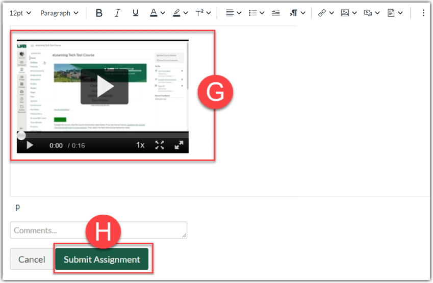 6. The selected video will be embedded (G) into the text box, click Submit Assignment (H).