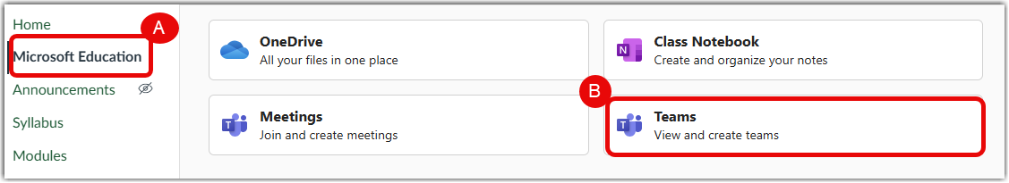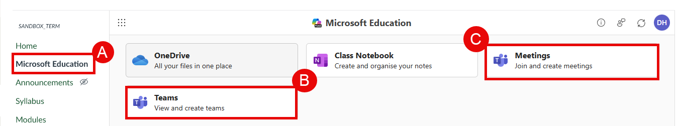 The Microsoft Education (A) Course Navigation in Canvas provides access to both Teams (B)and Meetings (C).These links must be enabled and set up by the course instructor.
