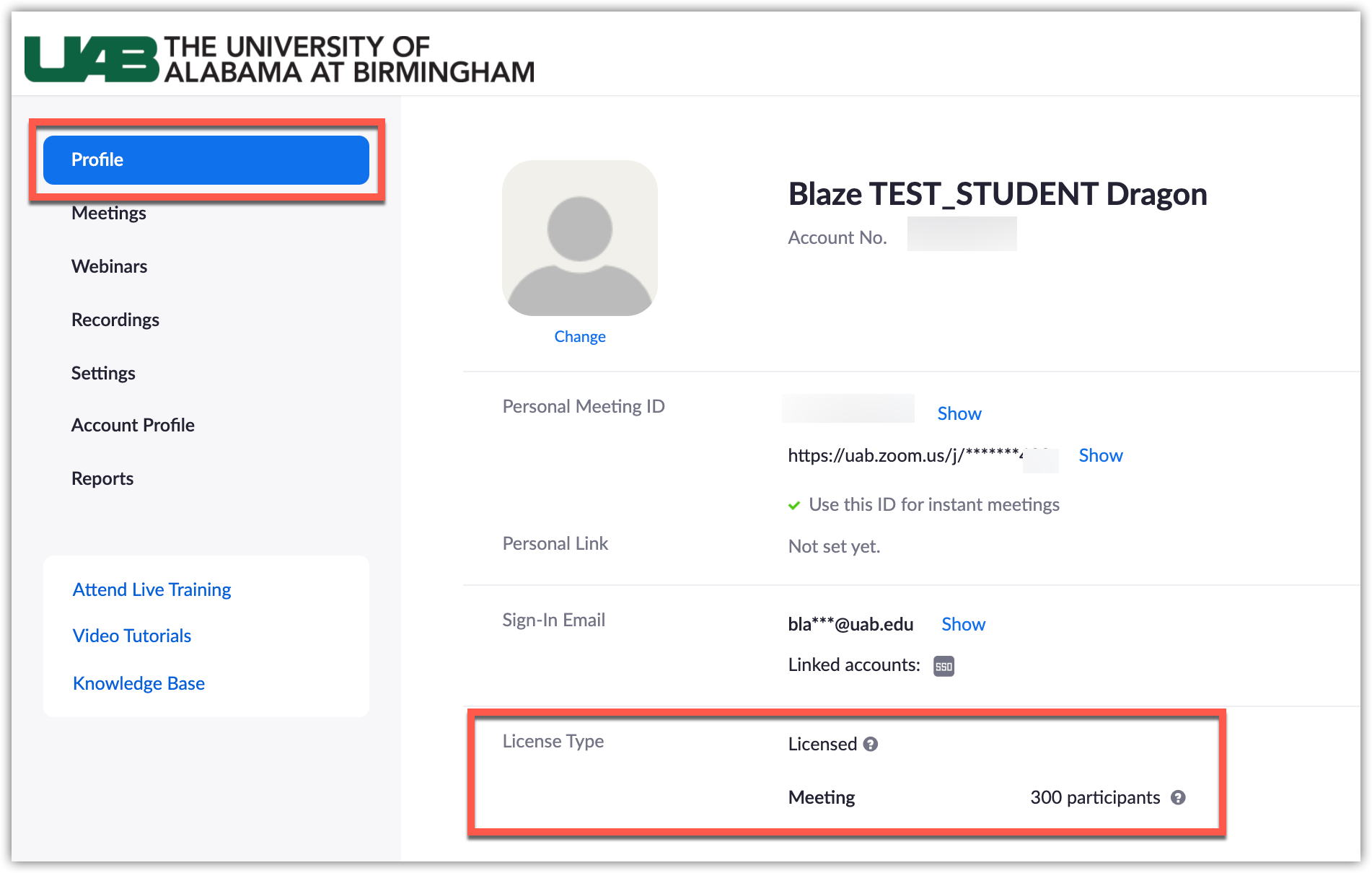 There are two main accounts at UAB: UAB Standard (Non-HIPAA) and UAB HIPAA. Users can log into their Zoom account in a web browser and click Account Profile at the far left, then look and see the type and name of the account they are under.