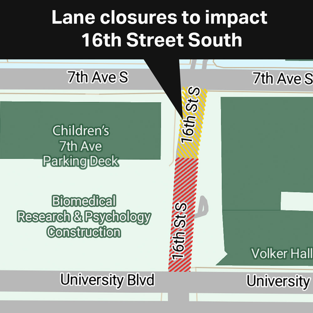 Effective Friday, May 9, the southern portion of 16th Street South between 7th Avenue and University Boulevard will be closed through the end of the year. Facilities is closing this portion of the road for the next phase in the ongoing construction of the new Biomedical Research and Psychology Building. Access to the Children's Hospital 7th Avenue Deck will remain open from the 7th Avenue side.