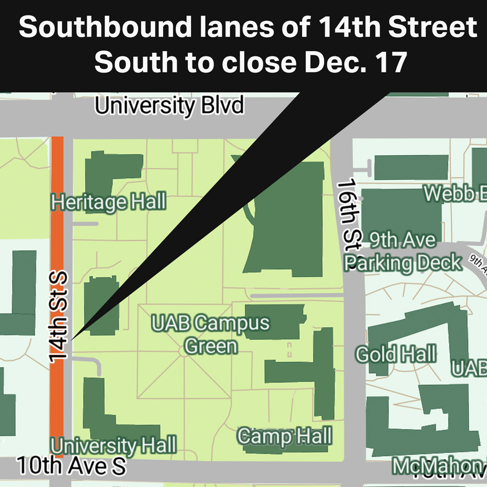 The southbound lanes of 14th Street South, from University Boulevard to 10th Avenue South, will close Tuesday, Dec. 17.