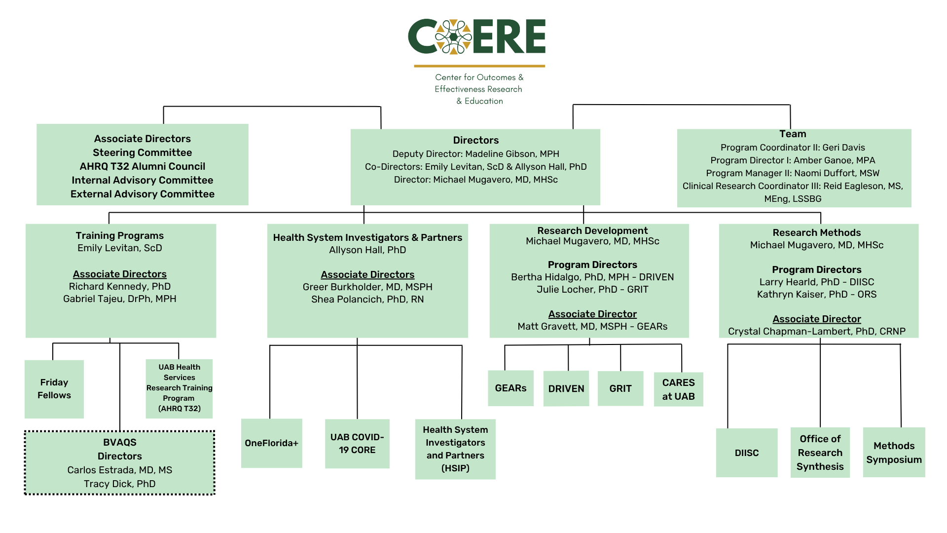 The COERE is organized into 3 functional units, each led by a Center Co-Director and Associate Directors; Training, Health System Investigators and Partners (HSIP) and Enrichment Programs. The leadership team spans the Schools of Health Professions, Medicine, Nursing and Public Health, and receives guidance from a Steering Committee, Internal Advisory Committee, and External Advisory Committee with broad collective expertise in the conduct of health services, outcomes, and effectiveness research spanning clinical, community, and public health settings.