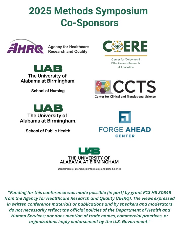 Initiated in 2009, the annual Methods Symposium is a signature program of the UAB Center for Outcomes and Effectiveness Research and Education. The overarching goal of the Methods Symposium is to provide a general overview and framework for recent developments and novel directions in a health services research (HSR) methodological area. The Symposium is intended for an interdisciplinary and interprofessional HSR audience across the career arc, from students to faculty at all ranks, and includes presentations from national thought leaders in a timely thematic methodological area, culminating with the Meredith Kilgore Endowed Lectureship sponsored by the UAB School of Public Health. The Kilgore Endowed Lectureship was established in 2020 to honor the late Dr. Kilgore’s innumerable contributions to HSR, mentorship, and training at UAB, including roles as Co-Director of the COERE and its AHRQ T32 until his untimely passing in 2019. Previously held in-person, the COERE is pleased to now offer the Symposium in hybrid format.