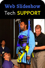 Patients relearn the natural motions of walking with the TheraStride system, which supports their weight while therapists guide hip and leg movements. |
