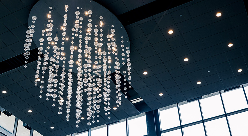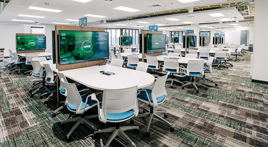 The interior of the atrium includes all-new furniture and light fixtures, providing students with new relaxation and study options. The space has been equipped with greenery, including a 24-foot-tall living plant wall. A custom chandelier was imported from Italy to give the area a unique aesthetic and ambiance. Morning Grounds, a new self-service coffee bar, was installed to serve the caffeine needs of Heersink School of Medicine faculty, staff and students.