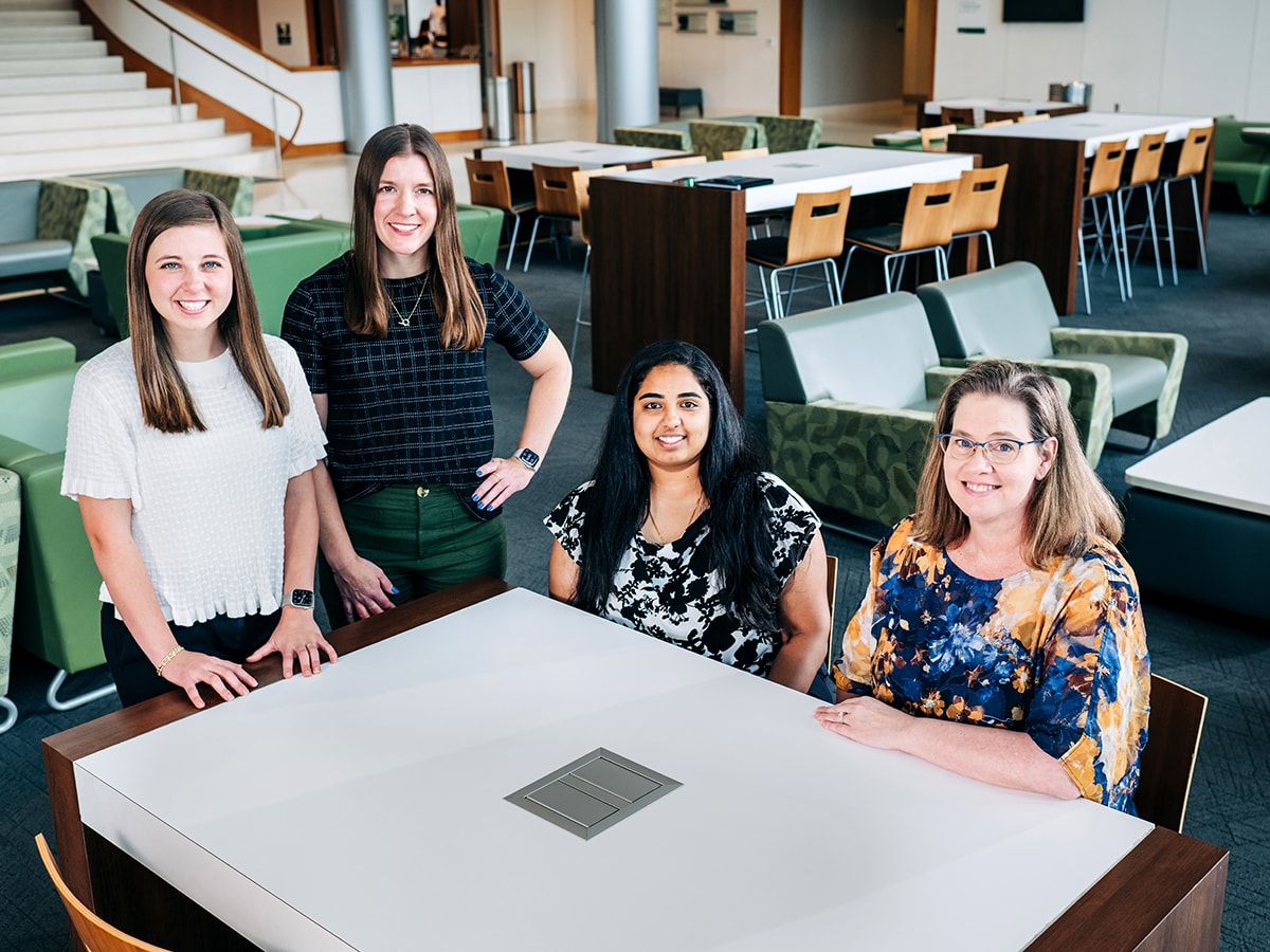 Cori Perdue, Ph.D. (right) with, left to right, Haley Nolen, Hannah Broom and Shivani Palaparthi at the Collat School of Business. Their project, tentatively titled the DISCovery Communication Coaching App, helps users better recognize different communication styles and tailor their messaging accordingly. Try it here.