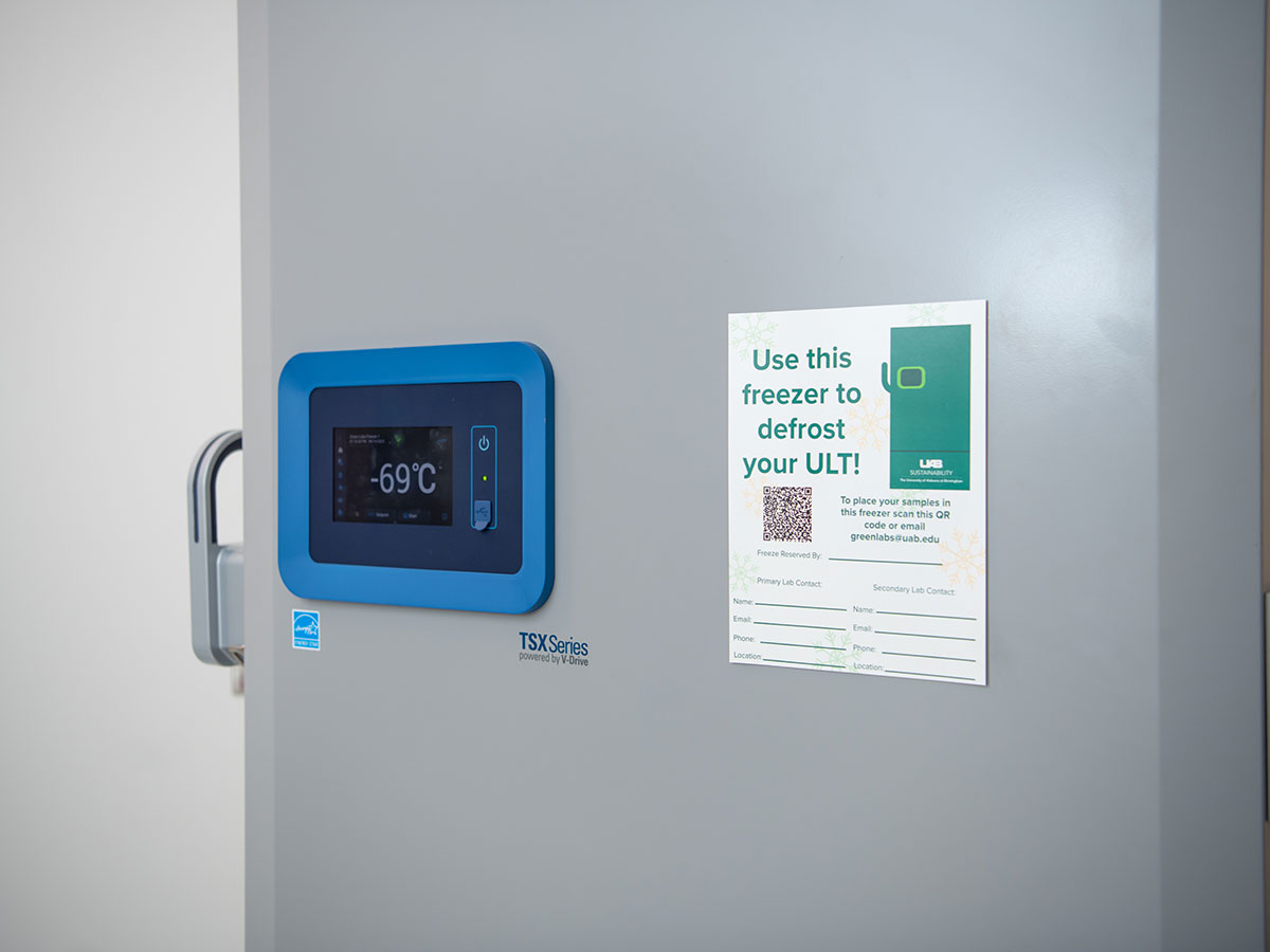 Overall, more than 150 UAB labs participate in the university’s voluntary Green Labs Program, a partnership between UAB Sustainability and UAB Environmental Health and Safety (both part of UAB Facilities). Labs that enroll start by completing a survey of their current energy efficiency efforts. Then they schedule an hourlong presentation with a Green Labs representative from UAB, who explains ways that labs can reduce their energy consumption, including shutting off equipment between uses and adding outlet timers to power down equipment outside operating hours.