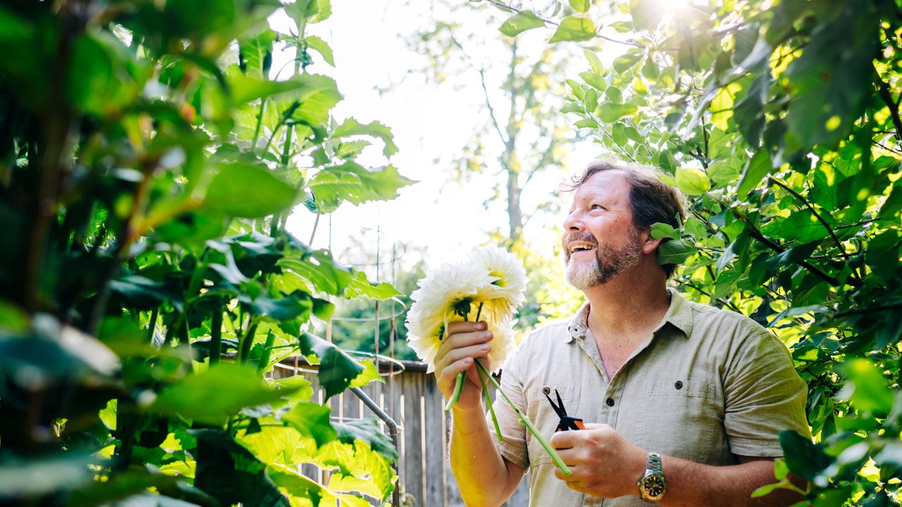 After work and on the weekends, he plans and plants the plot with his favorite vegetables, as well as herbs such as thyme and bay. He grows the dahlias and zinnias for his wife, Georgia. “I started growing flowers for her during the pandemic. They bring a splash of color into the house throughout the spring, summer, and early fall.”
